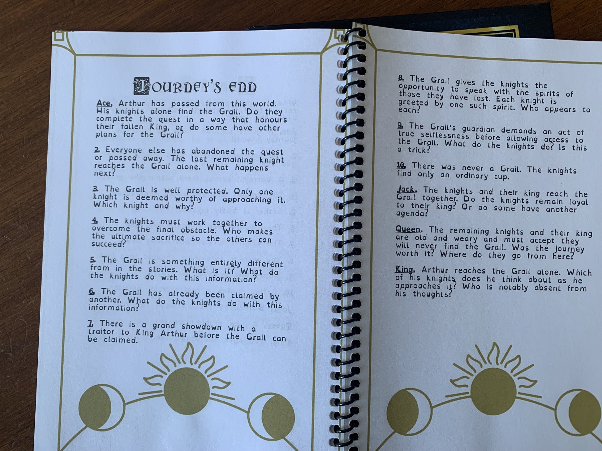 For the Grail is a Descended from the Queen game of epic adventure and quiet introspection. Players assume the roles of Knights of the Round Table accompanying King Arthur on his quest for the Grail. Across several sessions you will chart the course of their adventures using a standard deck of playing cards and a table of prompts.