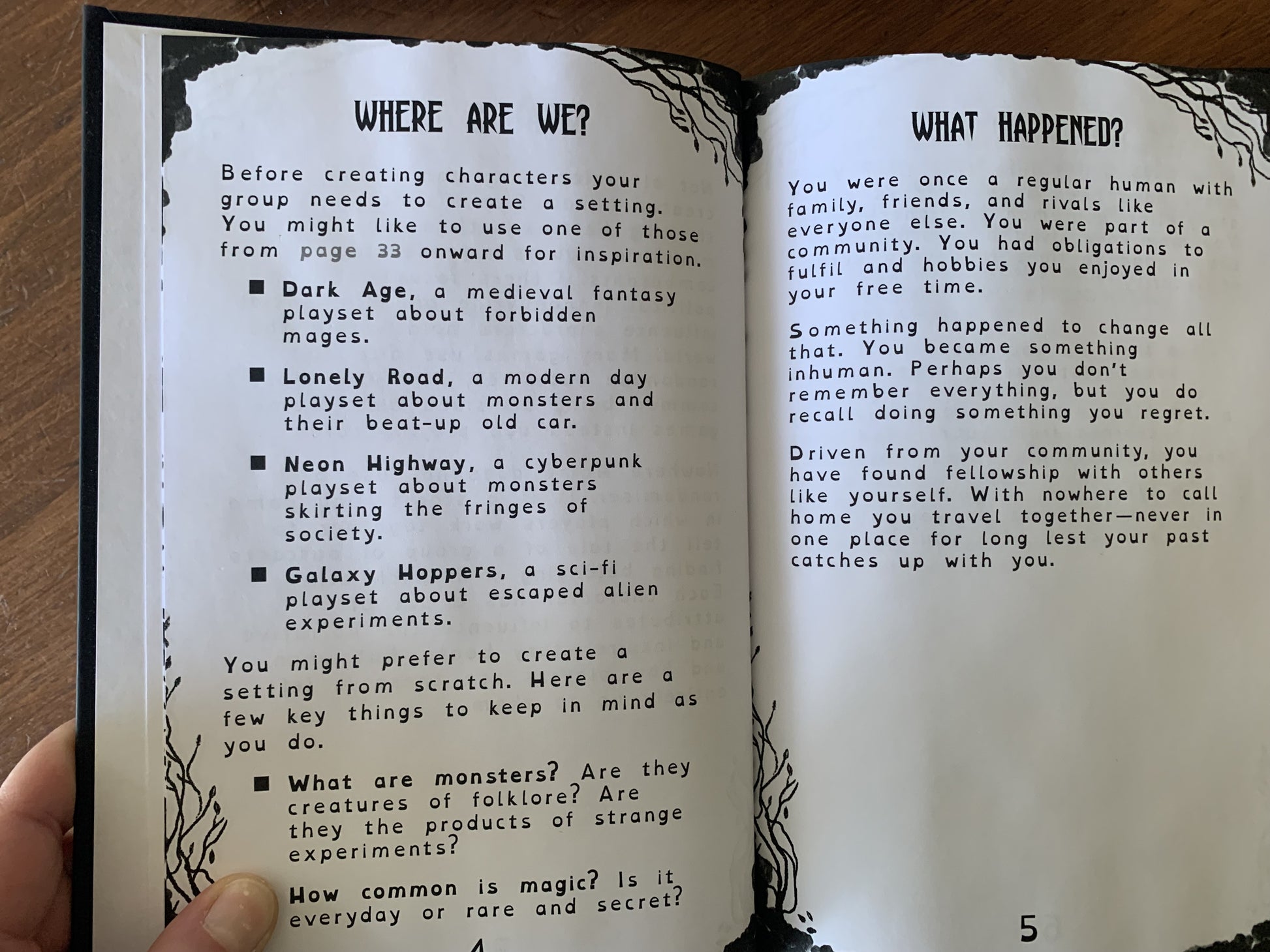 You were once a regular human with family, friends, and community like everyone else. Something happened to change all that. You became something monstrous—something which saw you driven from your home. Now you and your companions travel the land seeking fellowship and belonging. Is there a place for monsters like you?